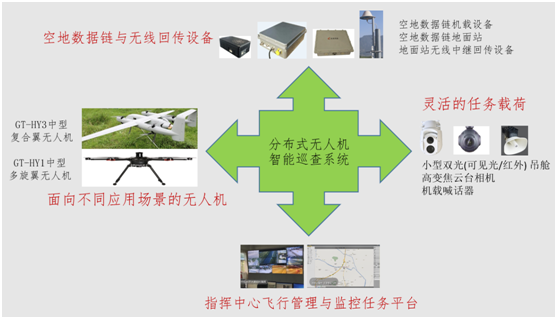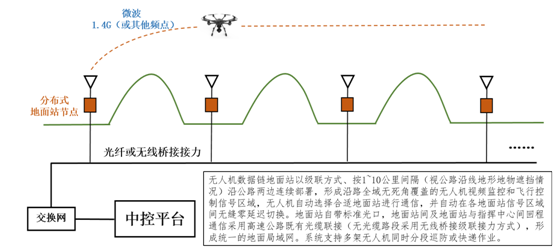 ①巡查区域可通过布设的分布式地面站任意扩展,不受地形地物限制,实现超视距巡查;